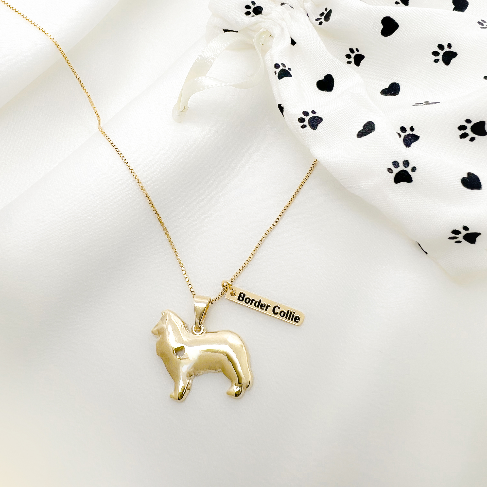 Colar Border Collie com plaquinha folheado a ouro, semijoia exclusiva Amare Pet para você ou para presentear alguém que ama essa raça tanto quanto nós.