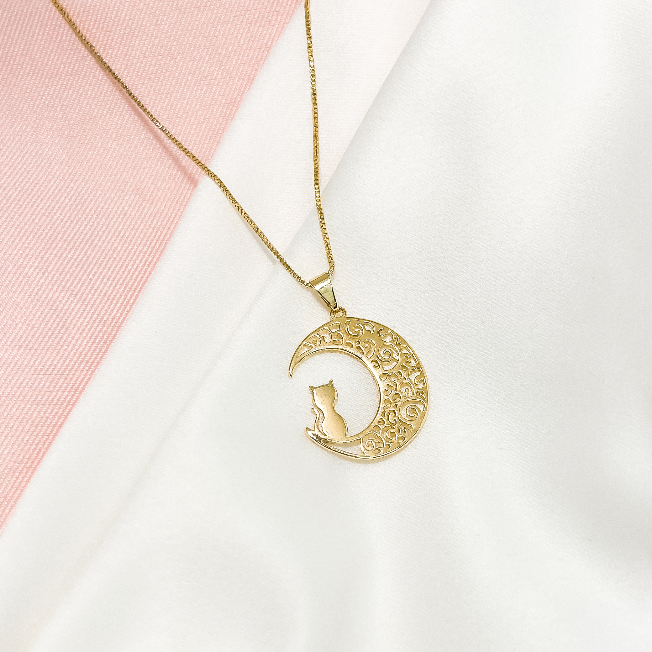 Imagine a serenidade de uma noite estrelada, onde a lua ilumina o céu e um gatinho brincalhão observa as estrelas. O Colar de Gatinho na Lua Detalhada folheado a ouro captura essa cena encantadora em uma peça de semijoia única. Este pingente é uma verdadeira obra de arte, meticulosamente esculpido para retratar um adorável gatinho sentado na curva suave da lua crescente. O banho em ouro 18k confere um brilho duradouro e um toque de luxo a esta peça única. Com sua elegância e charme atemporal, este pingente é a escolha perfeita para quem deseja expressar sua personalidade e paixões de maneira cativante. Deixe este pingente encantar seus sentidos e iluminar seu visual, assim como a lua e as estrelas iluminam nossas noites. Seja você um amante de gatos ou alguém que aprecia a beleza da natureza, este pingente é uma adição deslumbrante à sua coleção de semijoias.